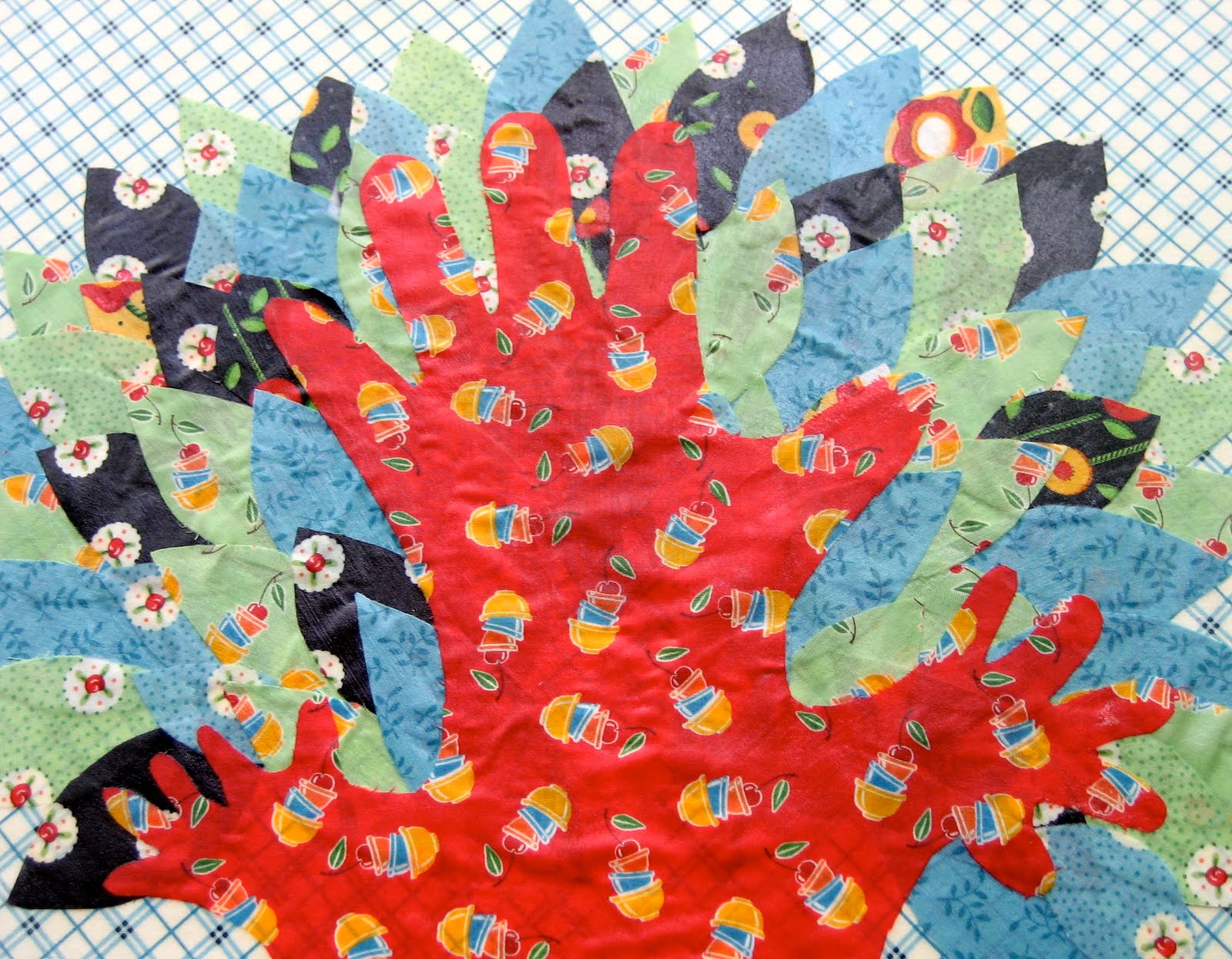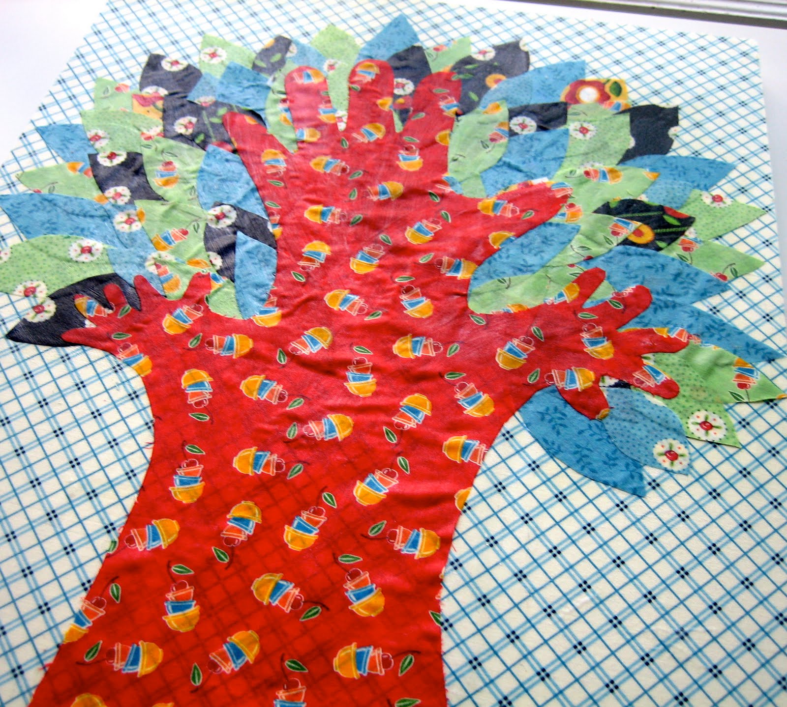 The leaves were made from several different green, blue and black fabrics – I wanted them to be different from the main trunk of the tree, though some of the fabrics did have flecks of red to tie them altogether.