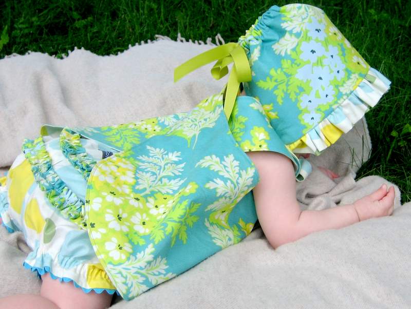 The dress is my Ruby Ruffle Dress pattern. It’s a little different in the back, but this Summer Garden outfit inspired the pattern. Since it’s not open in the back, it doesn’t have the bloomer pattern. The Ruby pattern is available in PDF or paper. Thanks!