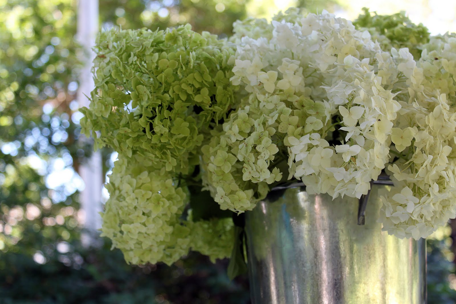 The flowers were cut from our own garden. We have several large hydrangea bushes that are in full bloom right now. So the morning of the party, I went out and cut a big bouquet of flowers. I placed the flowers in a silver, tall galvanized bucket to match some of the other decorations for the party. I love being able to use the nature around us – and what’s even better, is the flowers were absolutely free!