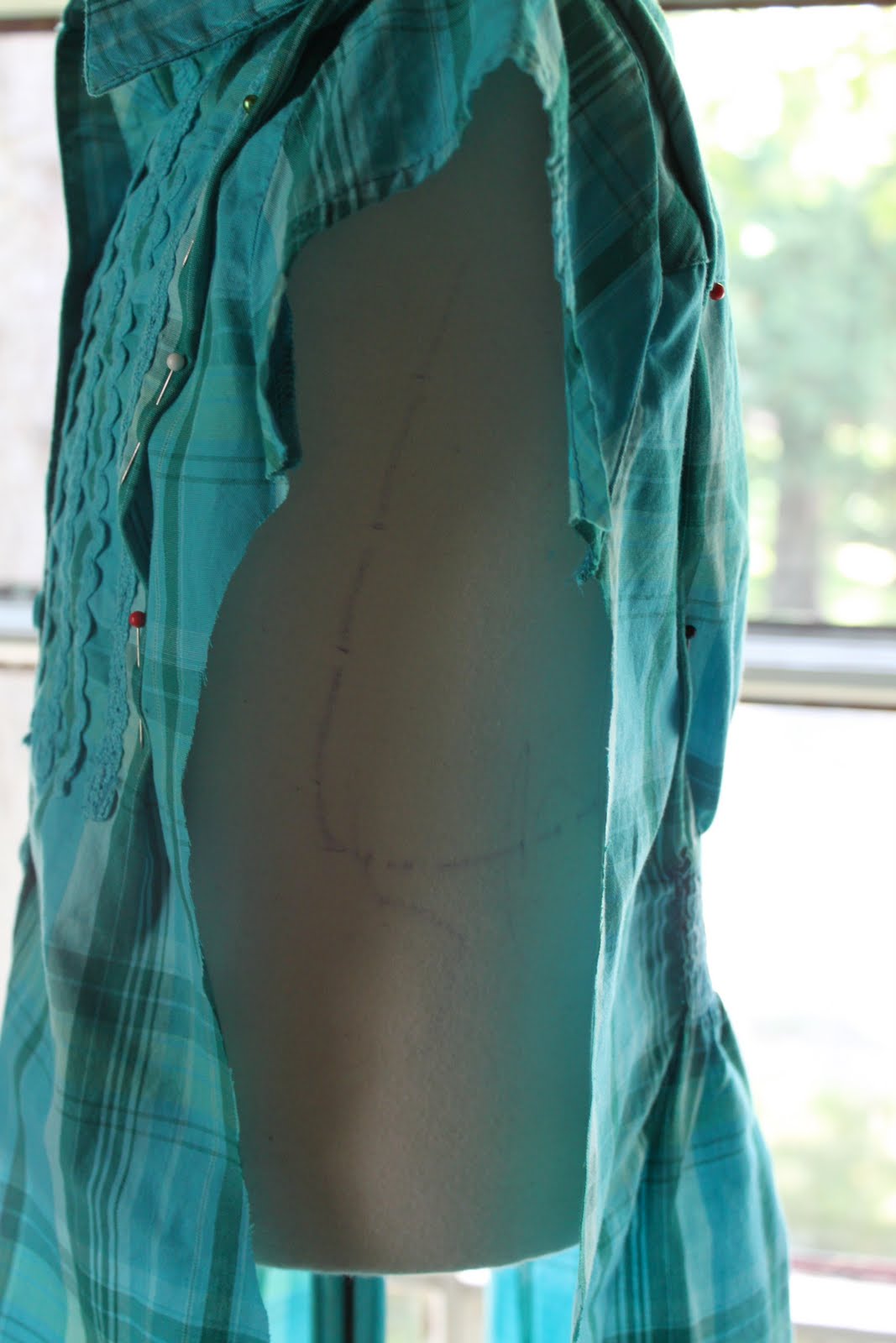 Then I stitched the side seams together – right-sides togethre. (Yes, that is crayon all over my dress-form – Savannah got a hold of this one when I wasn’t looking one day).