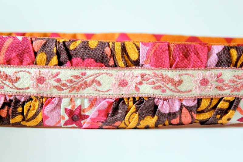 I used a gathering stitch on the top layer (don’t worry if you don’t know what that means, I promise to cover that in my “Sew Basics” series) and stitched the ribbon down the center of the ruffle. I then sewed the top layer to the bottom layer (right-sides together) and turn it right-side out to reveal the completed camera strap cover.