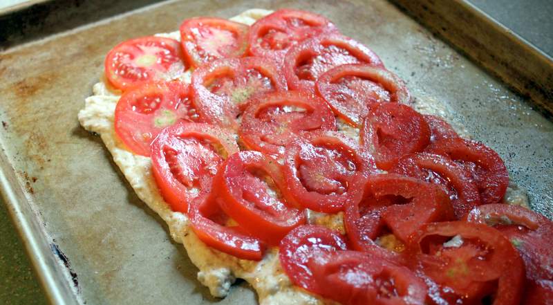 Basically white pizza is defined as pizza without tomato sauce. Sometimes you will find the tomato sauce substituted with an alfredo sauce or pesto sauce or just with no sauce at all. So here is my easy, white pizza recipe and I have to admit, this was so good. Best to make this recipe when tomatoes are truly in season – it takes the flavor to a whole new level.