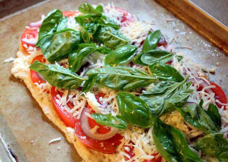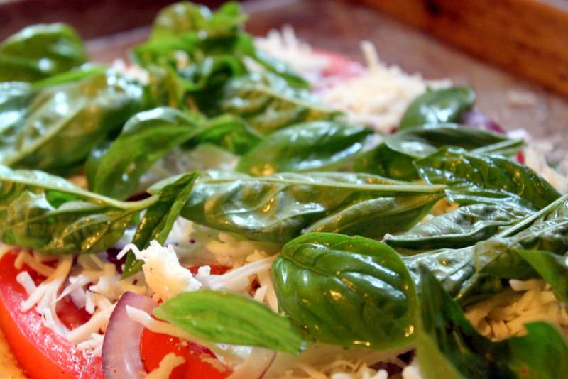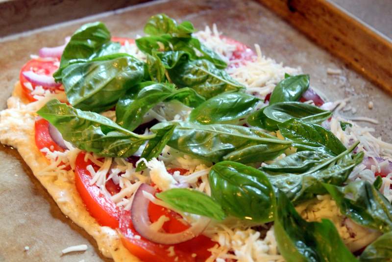 The tomatoes in our garden have finally started to ripen (yipee!) – it seems like they have taken forever this year! Last night we had three medium-large fresh tomatoes and a bunch of basil ready to use up, so what did I make? White pizza!