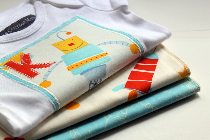 I made Shannon’s baby boy, Kevin, this little robot gift set. A custom appliqued organic cotton onesie and two cotton chenille burp cloths.