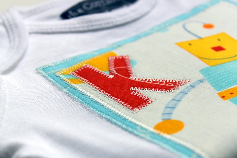 I used three fabrics for the applique. The light blue for the border, the robots for the main fabric and the red for the “K” (for “Kevin”). I applied the applique with fusible interfacing and I used a medium sized zig-zag stitch around the edge to prevent any fraying.