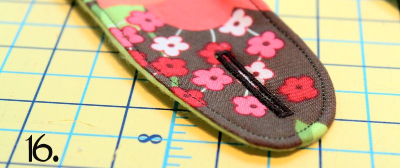 15. Prepare to sew a button hole in each strap (according to your machines directions). Start button hole 1/2″ from the end of the strap. Make it as big or as small as you need, depending on the buttons you have chosen to use.