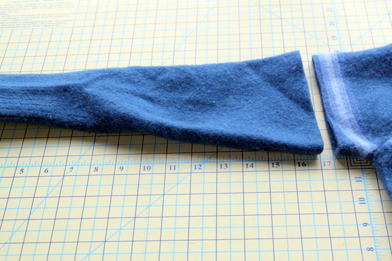Cut off each arm of the sweater. I wanted my gloves to come up right below my elbow, that way I can avoid getting any snow up my sleeve. You can cut them as long or as short as you would like. The lovely thing about felted wool is it will not fray so we do not need to worry about finishing any of the raw edges in this tutorial.