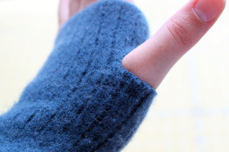 Here is my thumb poking out of the slit I cut in the felted wool. Make sure not to cut a slit too large, just about a 1/2″ will do.