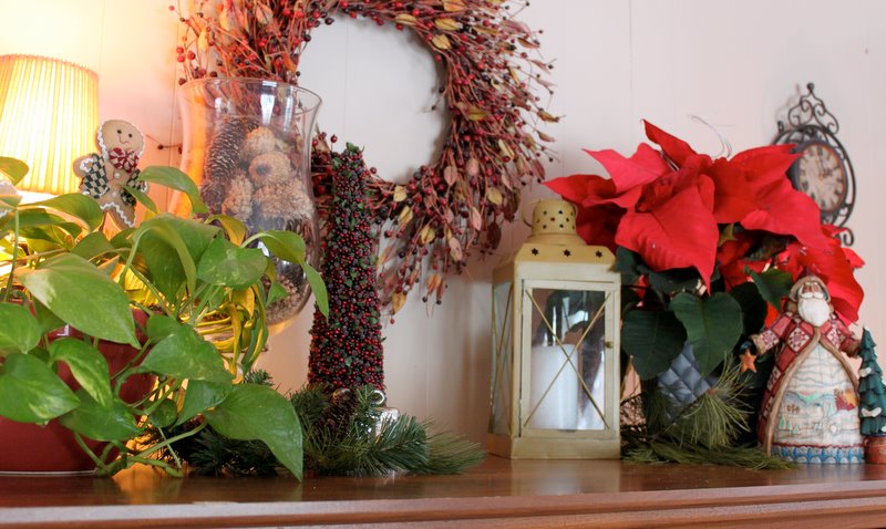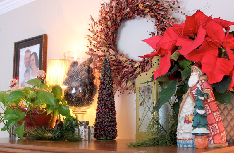 This is the top of our entertainment center. Again, the Christmas decor is mixed in with things I regularly keep up there such as the lantern, pine cones, lamp, wreath and plant.