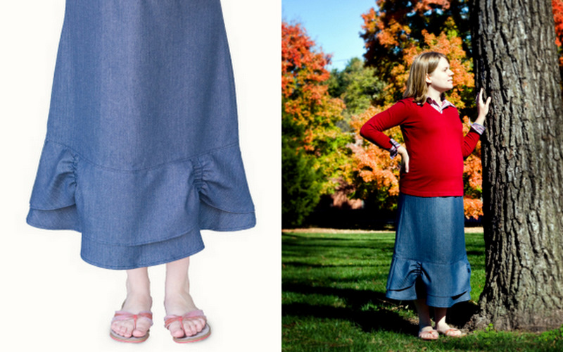 I love the flowing denim skirt, maternity since we are expecting #4 winter 2011.