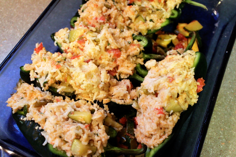 We both love Chile Rellenos, which is what I originally considered making with these beautiful poblano peppers. But the idea of frying something didn’t really appeal to me, so I came up with this slightly healthier alternative – Stuffed Poblano Peppers. These peppers are stuffed with a mixture of tomatoes, green chiles, zucchini, cilantro, rice, garlic, onions, Mexican spices and Monterey Jack cheese. They are baked in the oven and garnished with sour cream and more fresh cilantro.