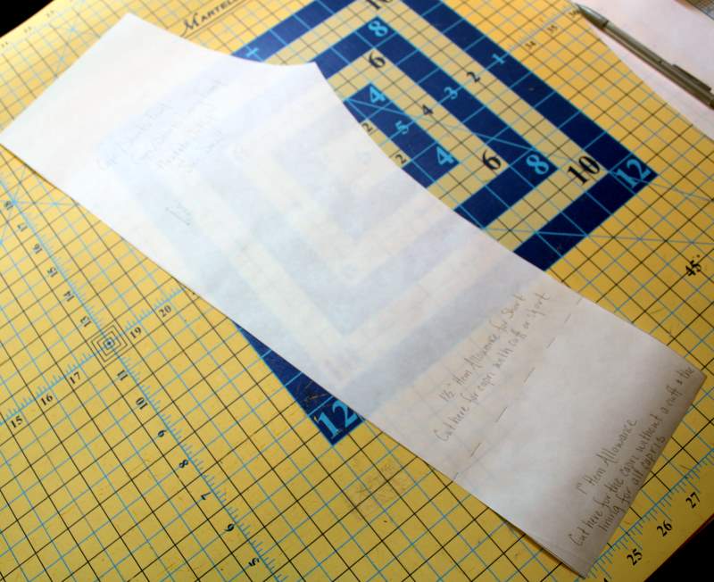 Here is one piece of the pants pattern that I’ve traced onto my freezer paper. I’ve removed the original pattern from underneath so I can easily cut out the pattern piece with my rotary cutter.