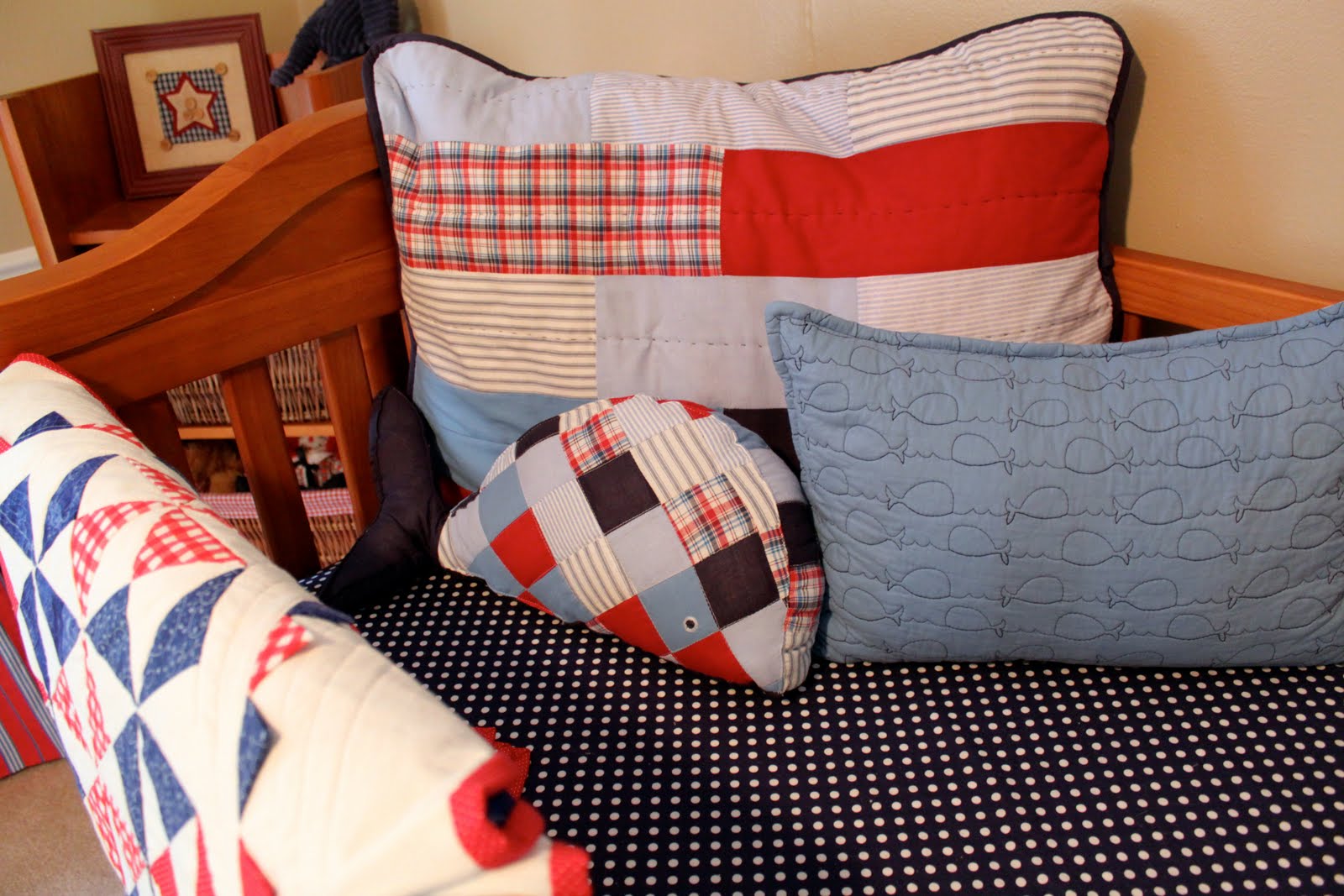 OMG! This is so adorable. I love the nautical theme. Grandma did an amazing job on the quilt and pillow!