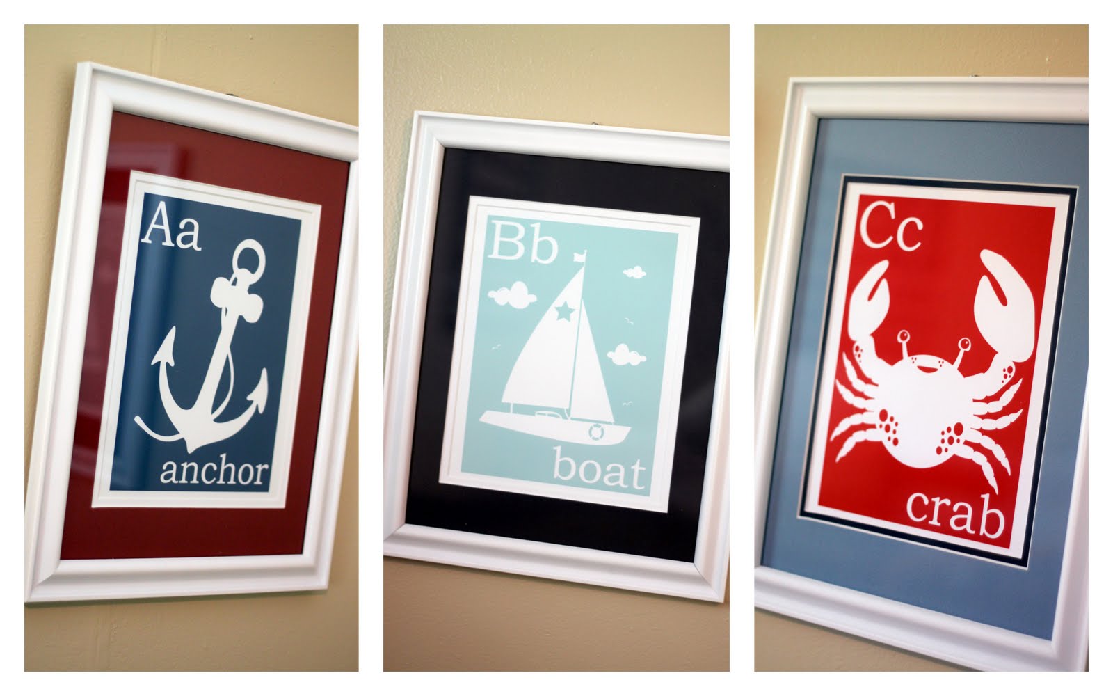I chose these three different 8 x 10 prints and then matted and framed them myself. I was so impressed with the high quality of this art work. I knew I wanted the Anchor, Boat and Crab because those fit with the nautical theme and I liked that is was an “A, B, C” thing going on. I chose the prints and then let Finny and Zook know the nursery colors and she selected the perfect colors to match the nursery. Pretty neat, right?