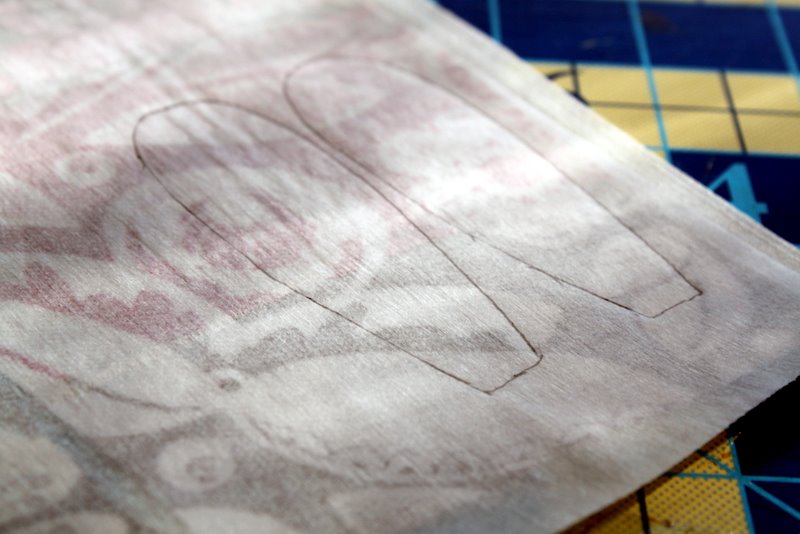 Trace the feathers onto the paper side of the interfacing. Trace about two feathers per scrap of fabric. Cut out feathers.
