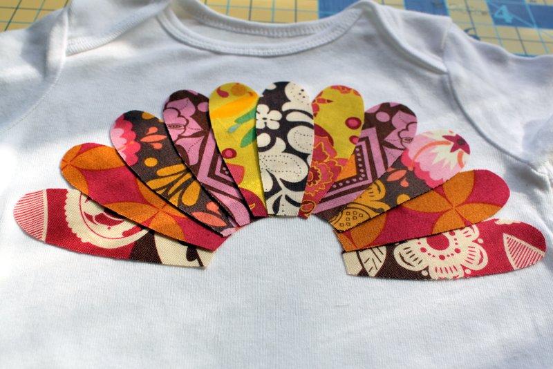 Once you have the feathers laid out the way you want them. Peel the paper backing off of the turkey body and place in the middle. Press the feathers and the body with a very hot iron to fuse the turkey to your shirt or onesie.