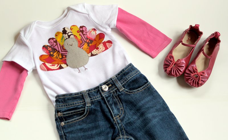 Thanksgiving is just around the corner and I wanted to make some shirts for my girls to celebrate one of my favorite holidays of the year. I love the fun and colorful nature of this turkey shirt. This is a wonderful way to use up those small scraps of fabric that you have lying around.