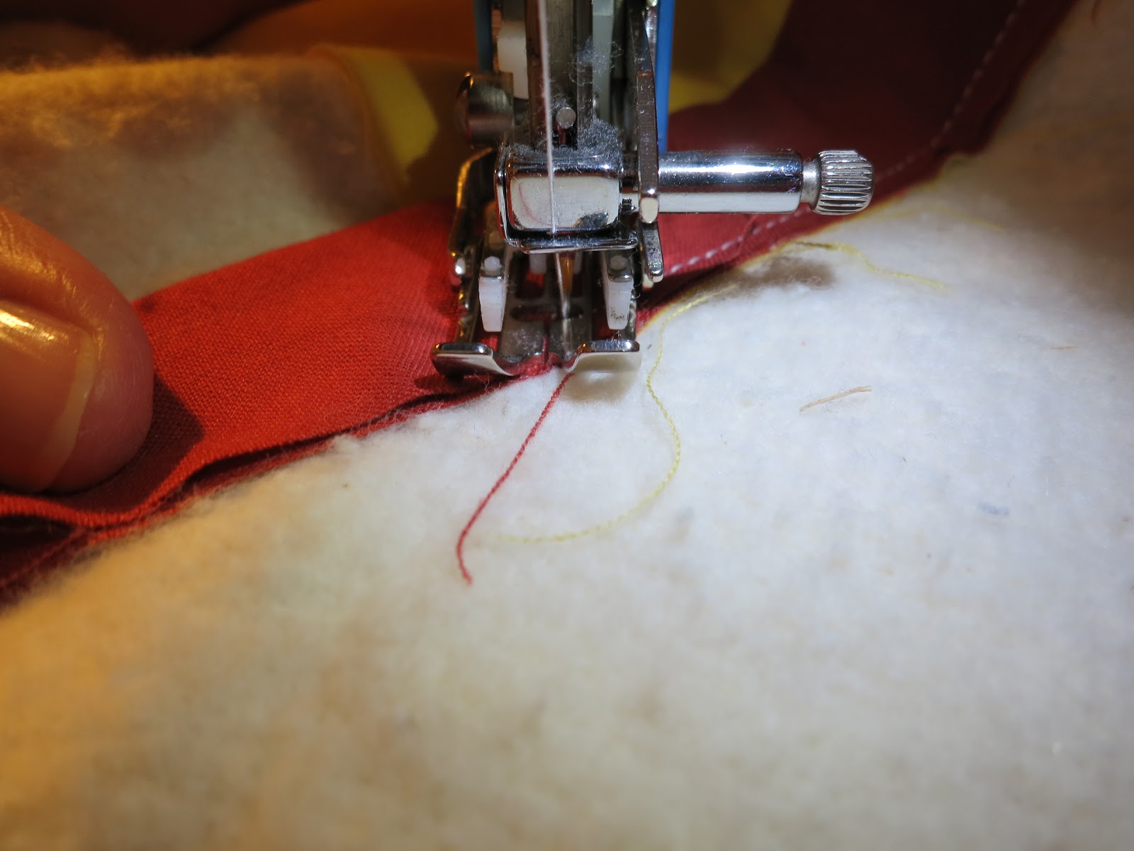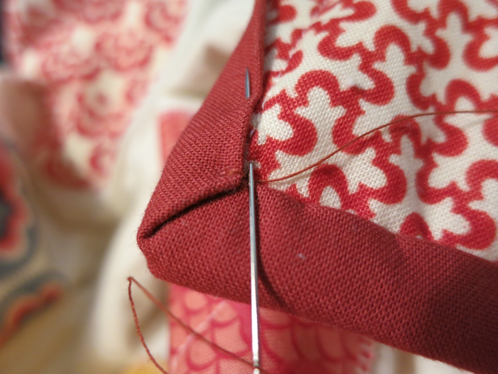 49. I start sewing the binding down on the bottom of the quilt and work right to left with my stitches. Using a single strand of thread, make a knot and pull needle through on the underside of the binding, catching slightly the batting and quilt back fabric and exiting right in the crease of the binding.