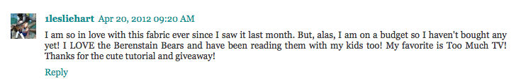 Congrats to Leslie! It’s so fun to win a giveaway:) And yay that she was wanting the fabric but it wasn’t in her budget! That makes it even more fun:)
