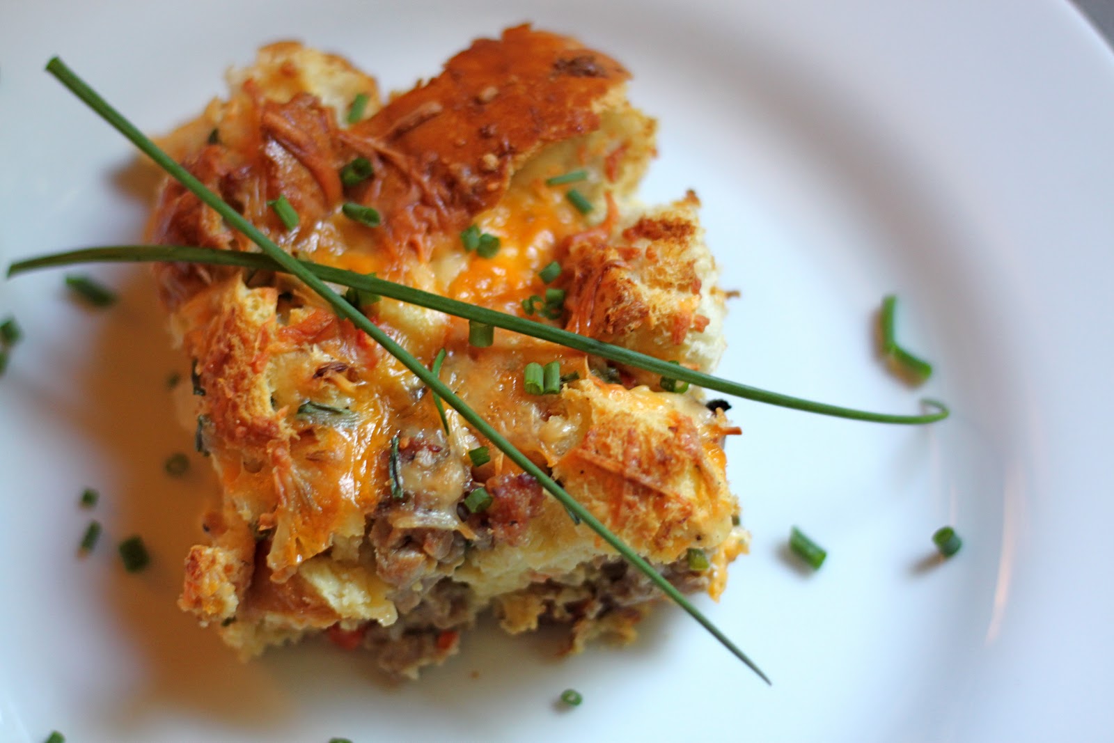This casserole turned out to be so tasty! I found this recipe here and tweaked it just a little bit. The casserole has a whole loaf of crusty bread, bulk Italian sausage, red bell pepper, onions and is soaked with an egg, milk, heavy cream, cheese and chives mixture. Are you hungry yet? You should be because this is so good!