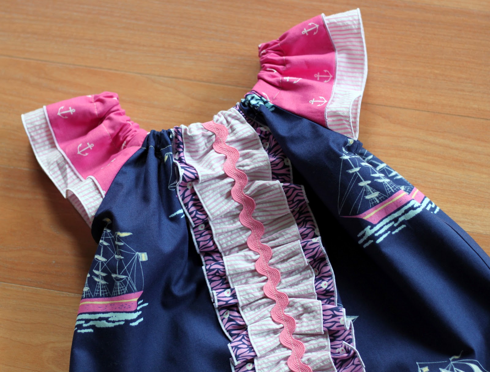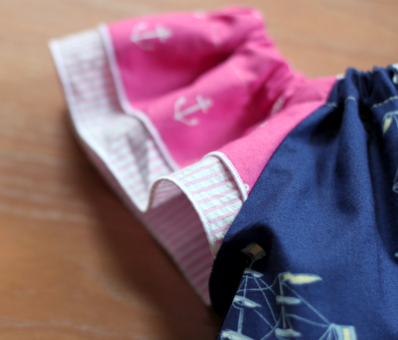 I did a double layer flutter sleeve with the pink anchor fabric on top and the pink and white seersucker underneath. I did a rolled edge on my serger to keep the sleeves as light and ‘fluttery’ as possible.