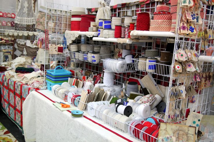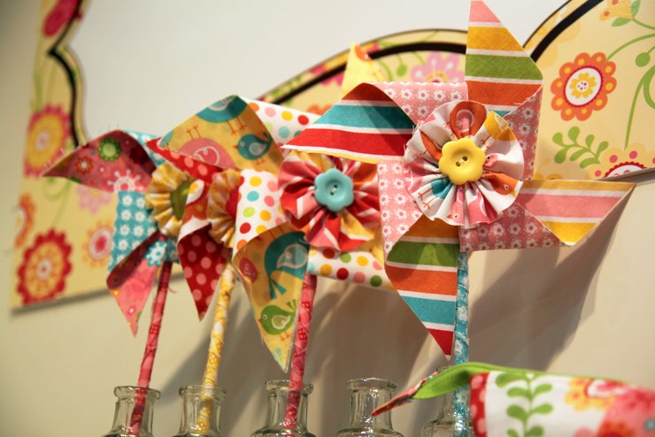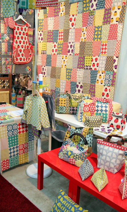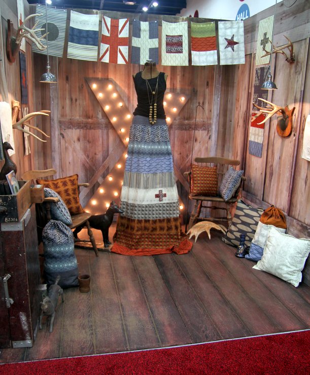 The Moda Fabrics booth never disappoints. Their booth display was gorgeous. A big theme this market seemed to be playing color off of white and so they had paint sticks that had been dipped in all different colors of paint for a rainbow effect. It was beautiful.