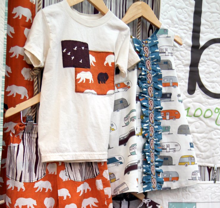 Here are a bunch of pieces that I sewed for the Birch Organic Fabrics booth. It was so much fun seeing them in person and on display. And what was even more fun was that my buddy, Shannon from Luvinthemommyhood sewed a bunch of pieces as well. Here is one of her amazingly adorable creations……..