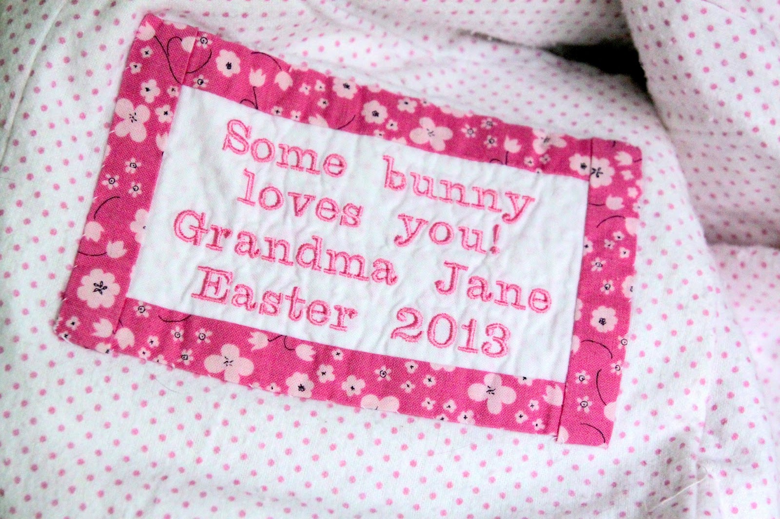 Step 11: I added an embroidered quilt label on the back and used the extra layer cake piece to frame it. Again, this was a built in font on my Baby Lock sewing and embroidery machine.