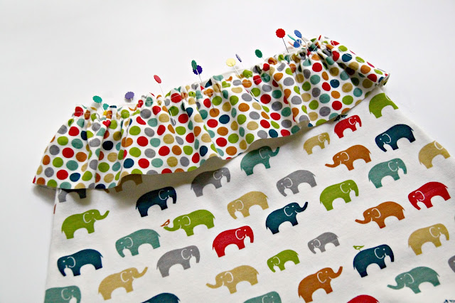 Run two rows of gathering stitches at 1/4″ and 1/2″. To gather, set your machine stitch length to the longest setting (mine is 5.0), bring up your machine tension to as high as it will go (mine is 9.0). Increasing the tension will help to start the gathering process. Also, when you are gathering knit, if you stretch the fabric a little bit as you go, the fabric will ruffle even more on it’s own. Just make sure you DO NOT backstitch at the beginning or end of the gathering stitch or your fabric won’t gather.