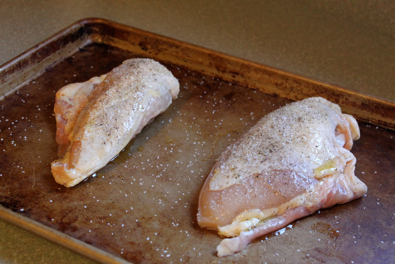 Drizzle chicken with olive oil and sprinkle liberally with salt and pepper. Roast chicken breasts (bone-in) in the oven for 45 minutes at 400 degrees or until the juices run clear. You can also use a store-bought rotisserie chicken for this dish and just remove the meat from the bone.
