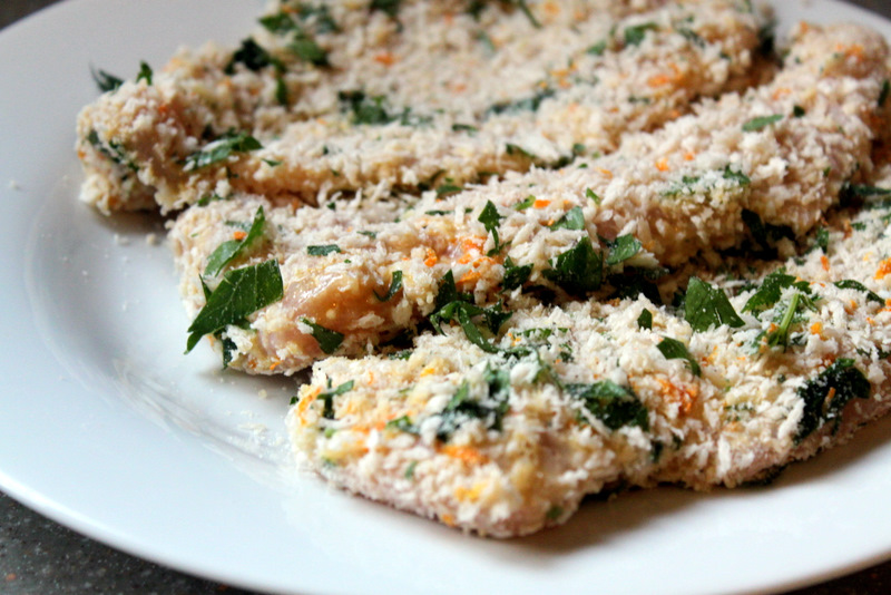 I breaded the chicken pretty much the same, however; I used panko bread crumbs instead of regular. You can find panko bread crumbs in most major grocery stores in the same section as the regular ones. I find they add a crunch to breading that really can’t be beat. The orange zest is key in this breading, so don’t leave it out even if you think it sounds strange.
