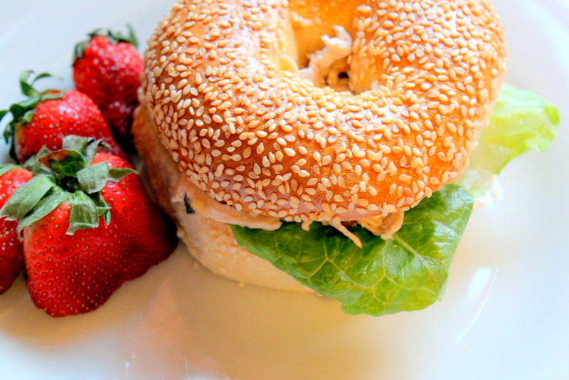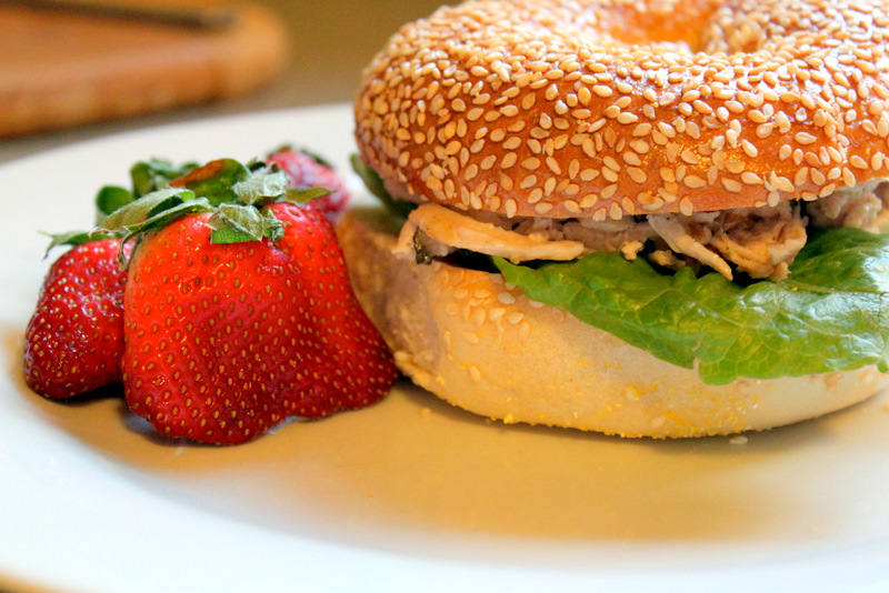 I’m on kind of a bagel kick right now, but traditionally this is served as a tea sandwich. Serve the chicken salad in between two pieces of white or wheat bread, cut off the crusts and cut into four triangles. This is a great dish if you are hosting a lunch or wedding/baby shower. It can be made up to a day in advance and just chill in the refrigerator.