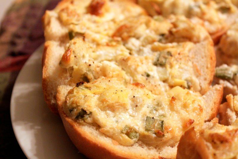 Baked Artichoke BreadIngredients:2 cans artichoke hearts in water1 cup good mayonnaise1 cup sour cream1/2 cup Parmesan cheese (plus more for sprinkling)4 green onions (sliced)Salt and pepper, to taste1-2 large loaves of Italian breadDirections:Preheat oven to 425 degrees.Drain both cans of artichoke hearts and chopped them. Mix chopped artichoke hearts, mayo, sour cream, Parmesan cheese, green onions, salt and pepper in a large mixing bowl.Slice bread length-wise down the middle. Place on a baking sheet. Spread artichoke mixture all over the top of the bread. Depending on your bread size, the mixture will cover 1-2 entire loaves. Once mixture is spread on top of bread, sprinkle Parmesan cheese all over the top and a little freshly ground black pepper.Place in oven and bake for 15-20 minutes or until the top is golden brown. To serve, slice 1-2 inch thick slices.Cottage Mama’s Note: This dish would be wonderful for holiday entertaining. Serve it as an appetizer or as a hearty side-dish with your favorite soup. -