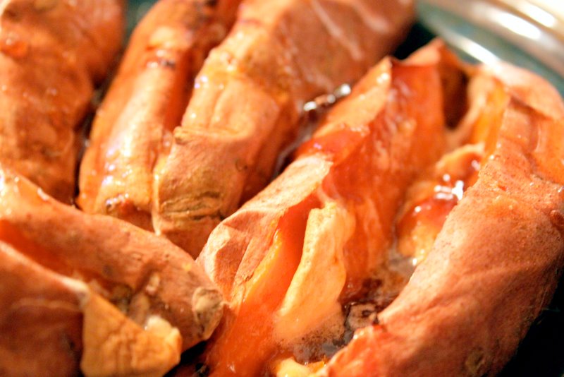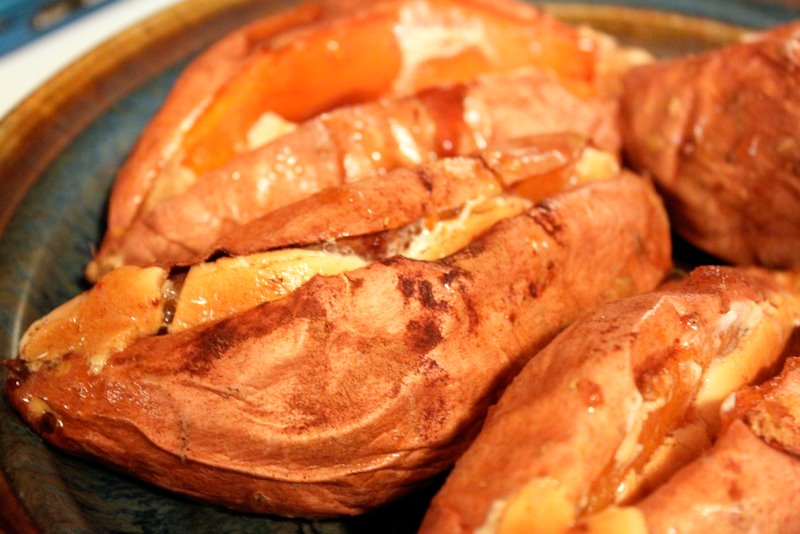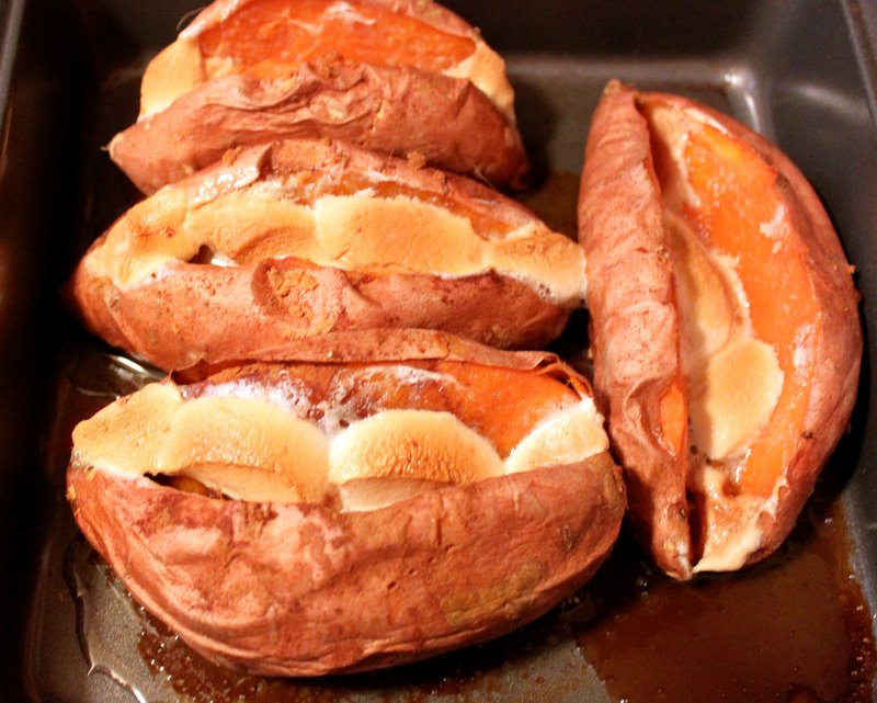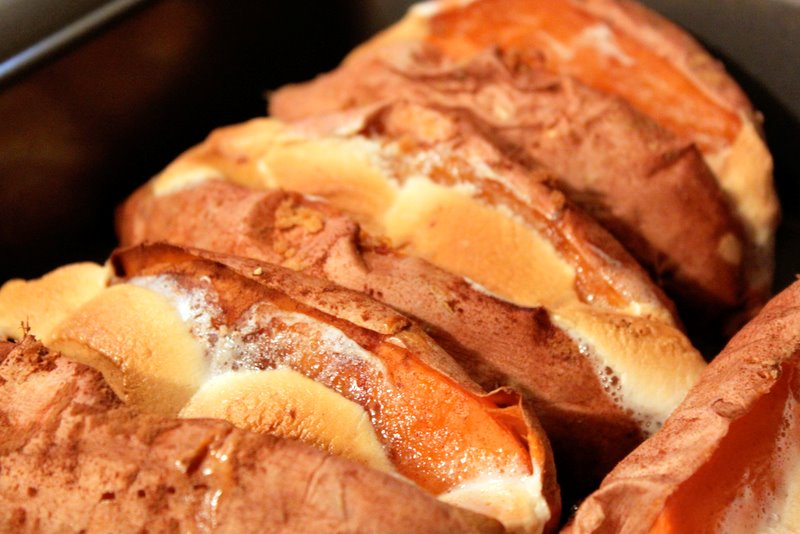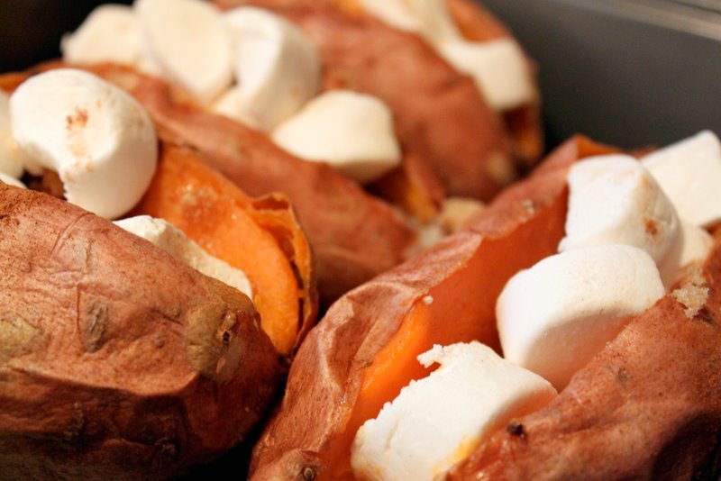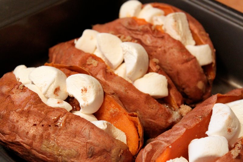 Brown Sugar Baked Sweet PotatoesServes 4Ingredients:4 medium-sized sweet potatoes4 tablespoons brown sugar2 tablespoons butterCinnamon, to sprinkle32 small marshmallows or 16 large ones cut upDirections:Heat oven to 400 degrees. Place sweet potatoes in a deep baking dish and poke several holes in each one. Place in oven and bake for 45 minutes or until tender.Meanwhile, cut your two tablespoons of butter into four equal pieces.
